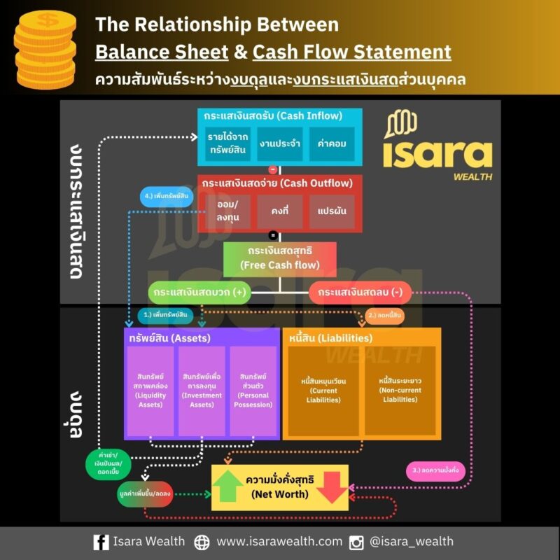 เราลองมาดู Diagram ด้านล่างนี้ประกอบครับว่างบกระแสเงินสด ส่งผลต่องบดุลอย่างไรบ้าง และมีความเกี่ยวข้องกันอย่างไร โดยผมสรุปเป็น Scenario เป็นข้อ ๆ ดังนี้ครับ