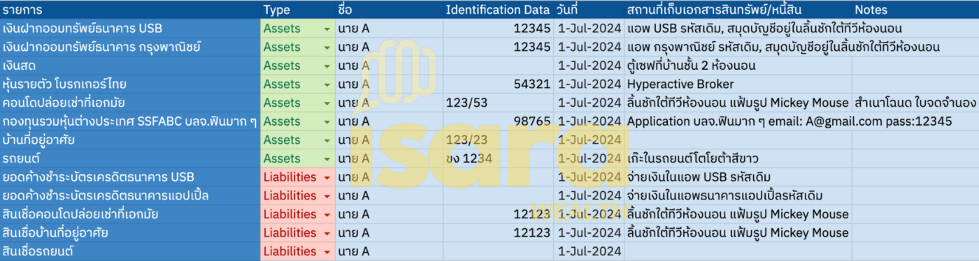 นอกจากนี้การทำแบบนี้ยังทำให้เรารู้ด้วยว่ามีทรัพย์สินอยู่ที่ไหน เลขอะไร เก็บไว้ที่ไหน เพื่อที่หากมีเหตุการณ์ฉุกเฉินที่ต้องอาศัยข้อมูลตรงนี้ก็จะทำให้คนในครอบครัวของเราสามารถทำหน้าที่ช่วยดูแลทรัพย์สิน และหนี้สินของเราผ่าน Spreadsheet ที่เราทำไว้ให้ครับ