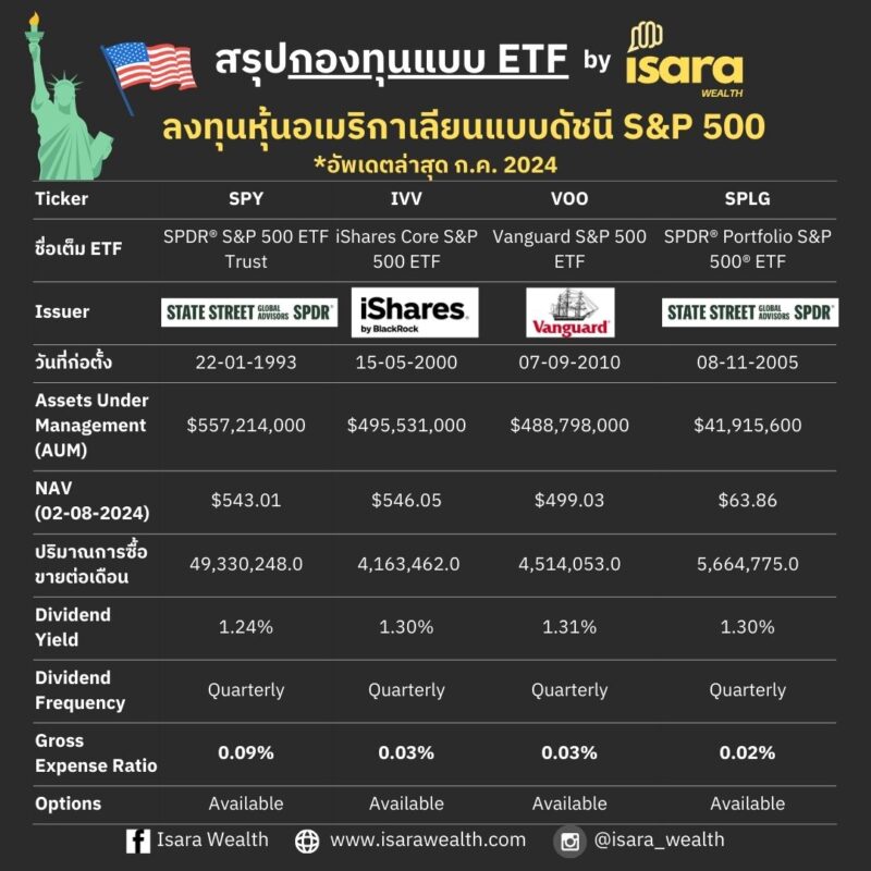 ส่วนความแตกต่างของแต่ละตัว ผมสรุปง่าย ๆ คือ SPY เก่าแก่สุด และสภาพคล่องสูงที่สุด เหมาะกับสายเทรดครับ แต่ค่าใช้จ่ายกองทุน ETF รวมก็จะแพงสุดเช่นกัน ส่วน SPLG คือ ETF น้องใหม่ ออกโดยเจ้าของเดียวกับ SPY เพื่อแข่งกับเจ้าอื่นในเรื่องค่าธรรมเนียมครับ