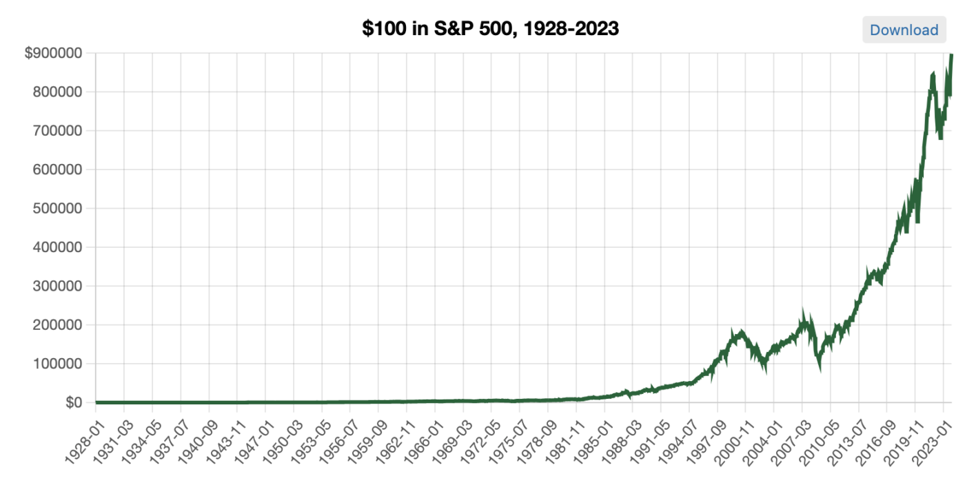 หากคุณลงทุน $1 ในดัชนี S&P 500 ในต้นปี 1928 โดยที่ไม่ถอน และนำเงินปันผลทั้งหมดกลับมาลงทุน 97 ปีผ่านไปจนถึงสิ้นเดือนกรกฎาคมปี 2024 คุณจะมีเงินประมาณ $9,050.49 ในปลายปี 2023 โดยสมมติว่าคุณได้นำเงินปันผลที่ได้ทั้งหมดมาลงทุนใหม่ นี่เป็นผลตอบแทนจากการลงทุนที่ 905,049.07% หรือผลตอบแทนทบต้น 9.89% ต่อปี