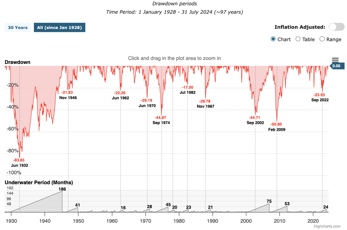 จากกราฟจะเห็นได้ว่า Drawdown ที่หนักที่สุดของ S&P 500 เกิดขึ้นเมื่อปี 1930 ติดดอย (Underwater period) ลงไปถึง -83.65% นานถึง 186 เดือน หรือ 15.5 ปี! แม่เจ้านานมากกกก ซึ่งตอนนั้นเกิดจากวิกฤต The Great Depression เศรษฐกิจถดถอยครั้งใหญ่ และการล้มของธนาคารในสหรัฐฯ