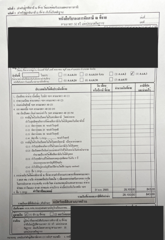- หากเงินค่ารับเวรเอกชนหรือคลินิกความงาม ที่คุณหมอไปทำงานเป็นครั้งคราว ออกเงินได้ให้คุณหมอเป็น 40(6) แต่โดนหัก 3% ณ ที่จ่าย และคุณไม่มีสัญญาเช่าสถานพยาบาล เป็นเงินได้ 40(2)